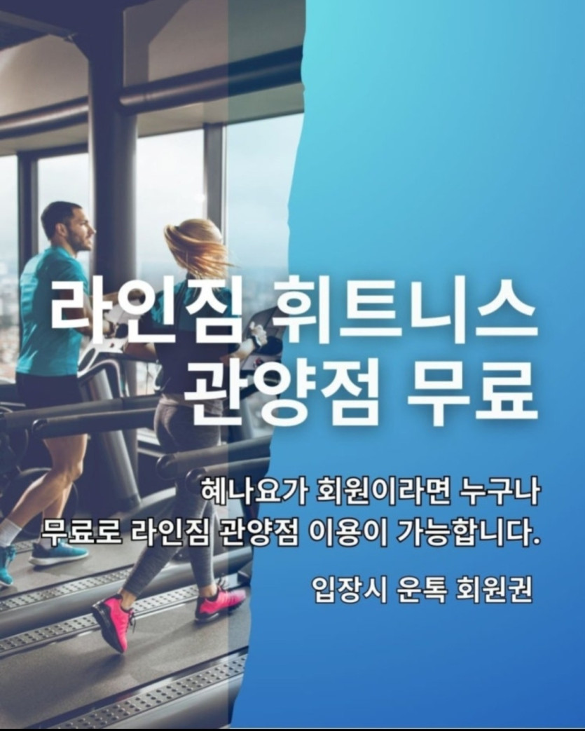 혜나요가 회원님이라면 누구나 "라인짐 휘트니스"의 헬스 시설과 샤워 시설을 모두 무료로 이용하실 수 있습니다.